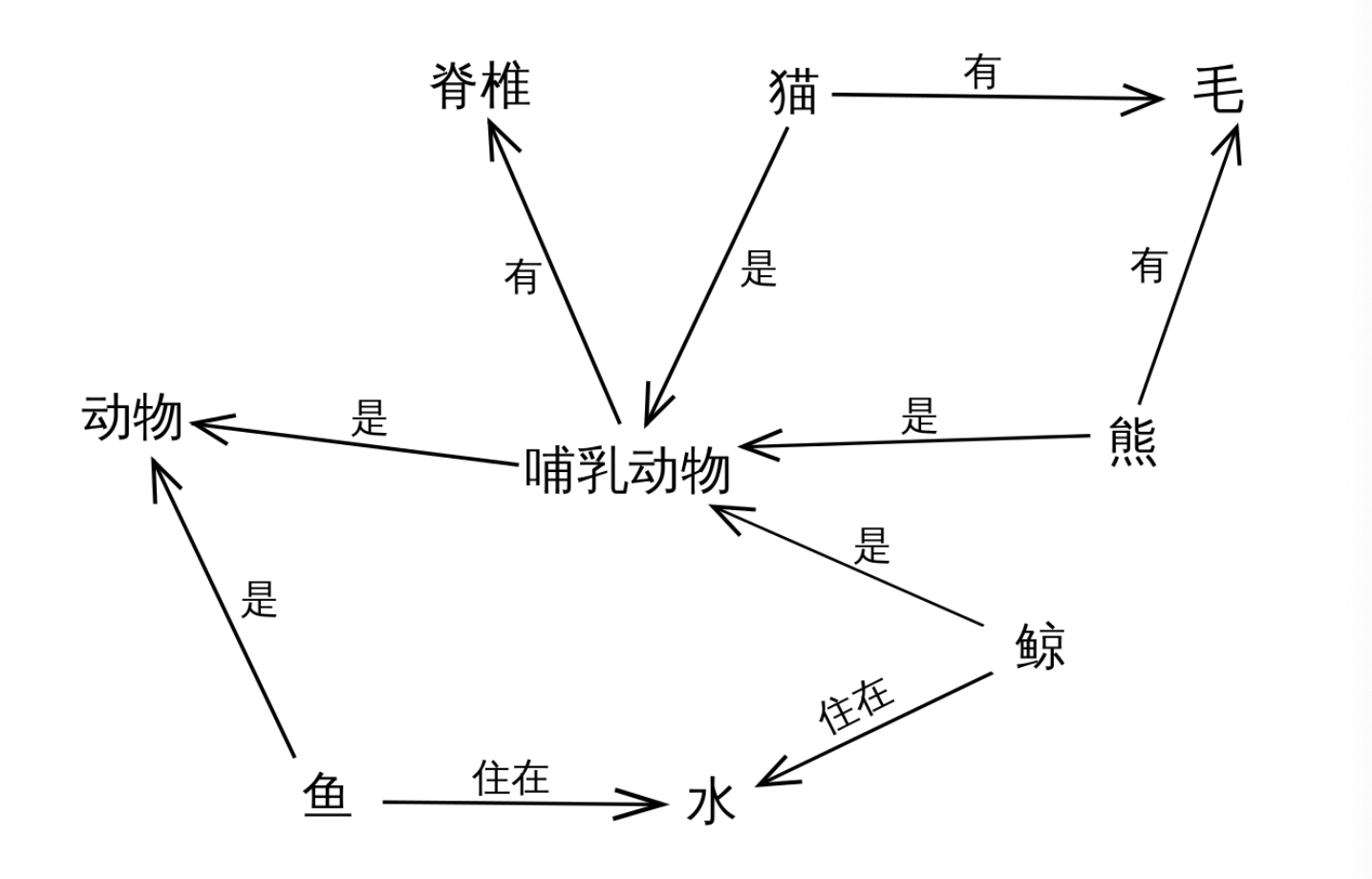 - 例如下图: 实体(点)可以是哺乳动物, 熊, 脊椎, 鱼, 水等; 关系(线)可以表明是, 有, 住在等关系.
