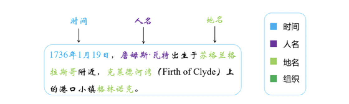 如图所示,“1973年1月19日”是时间实体;“詹姆斯·瓦特”是人名实体;“苏格兰”、“格拉斯哥”、“克莱德河湾”、“格林诺克”是地名实体。在不同领域的实体抽取任务之中,还会增加其他类型的实体。例如,在一般的医疗知识图谱之中,还会增加疾病、药物、治疗方法等实体。