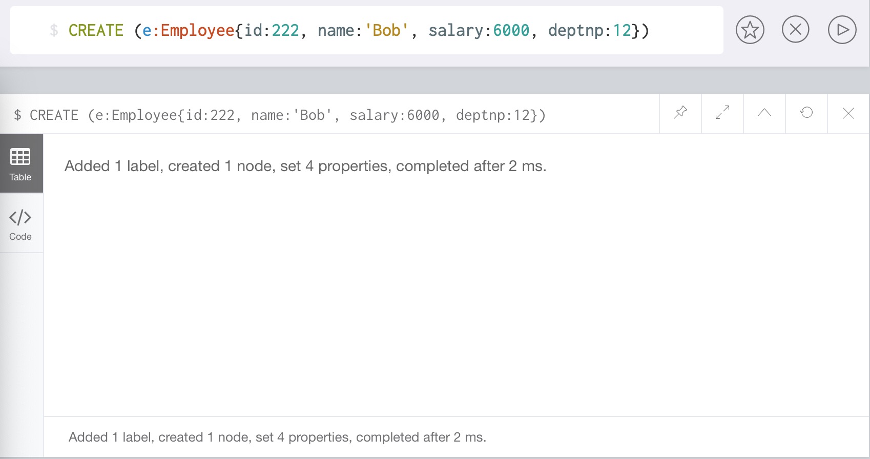 CREATE (e:Employee{id:222, name:'Bob', salary:6000, deptnp:12})