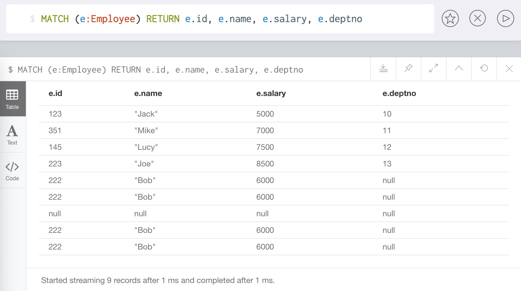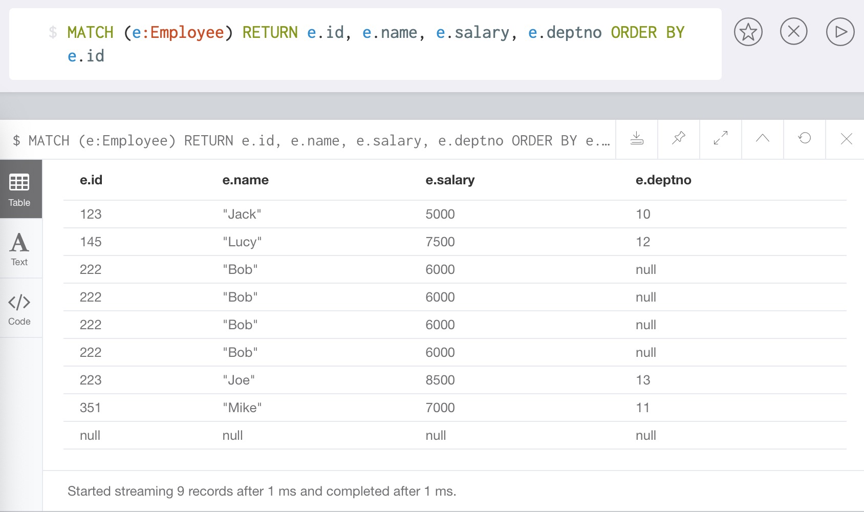 MATCH (e:Employee) RETURN e.id, e.name, e.salary, e.deptno