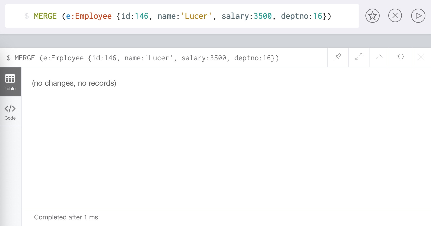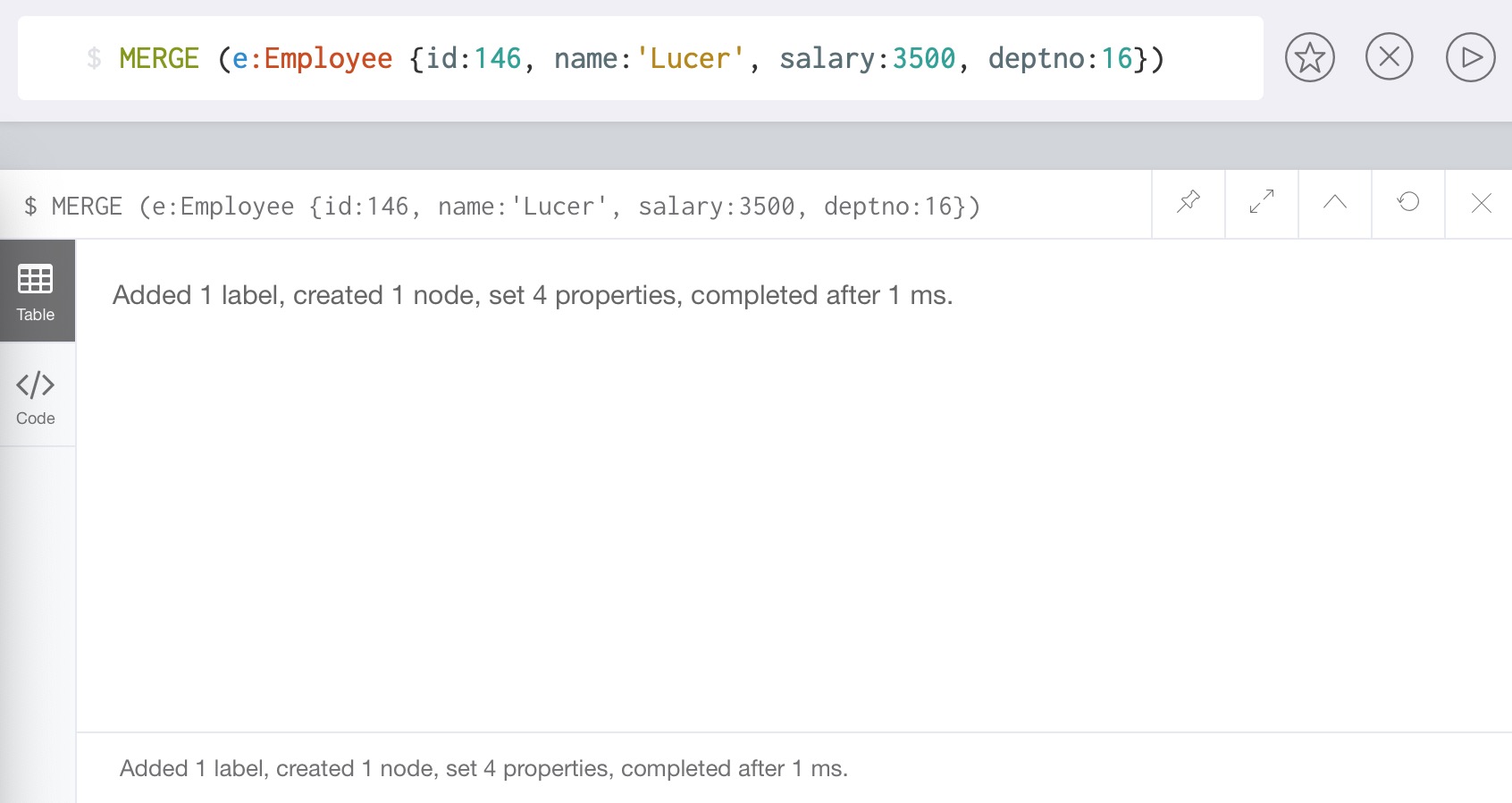 MERGE (e:Employee {id:146, name:'Lucer', salary:3500, deptno:16})