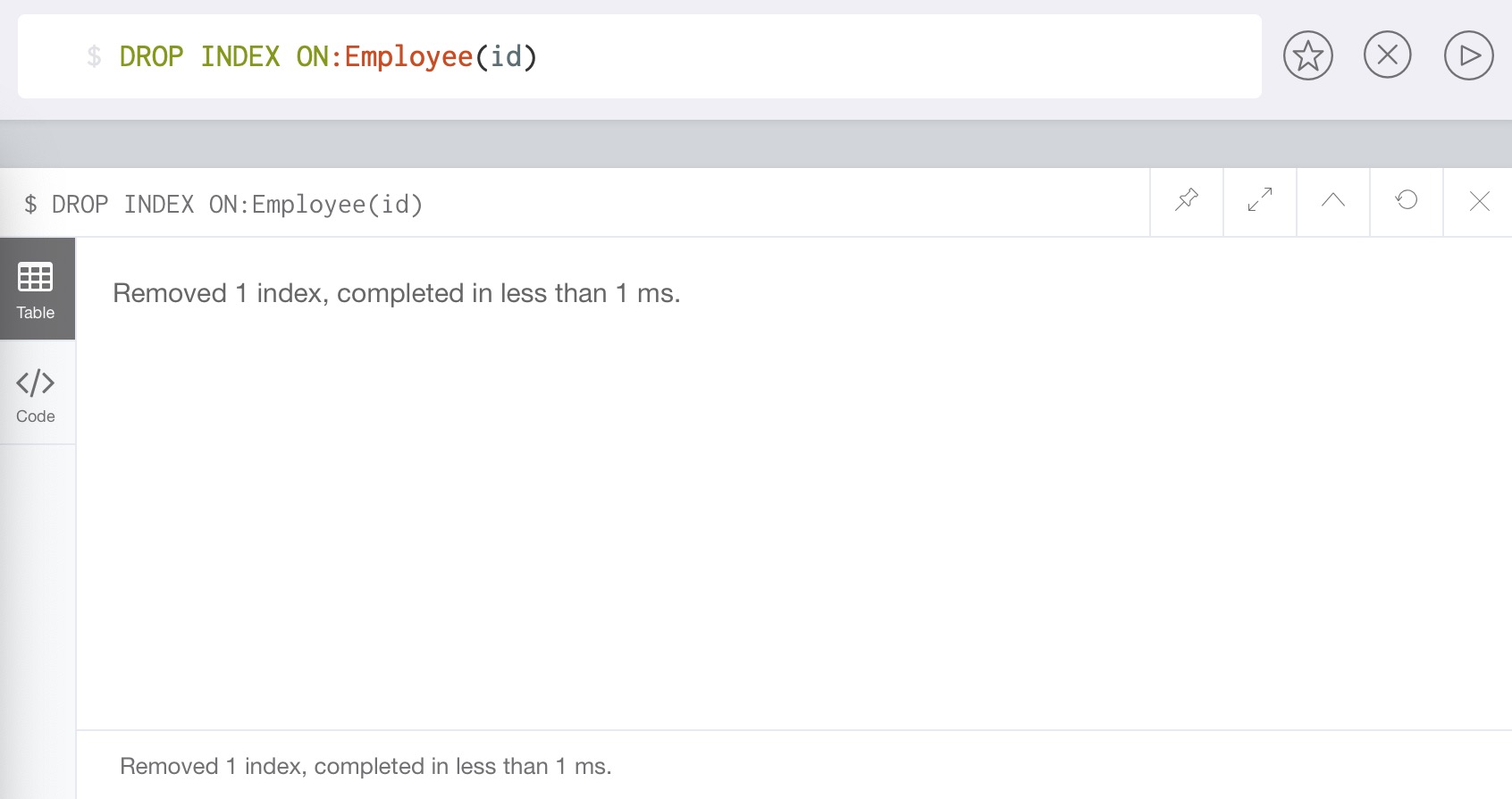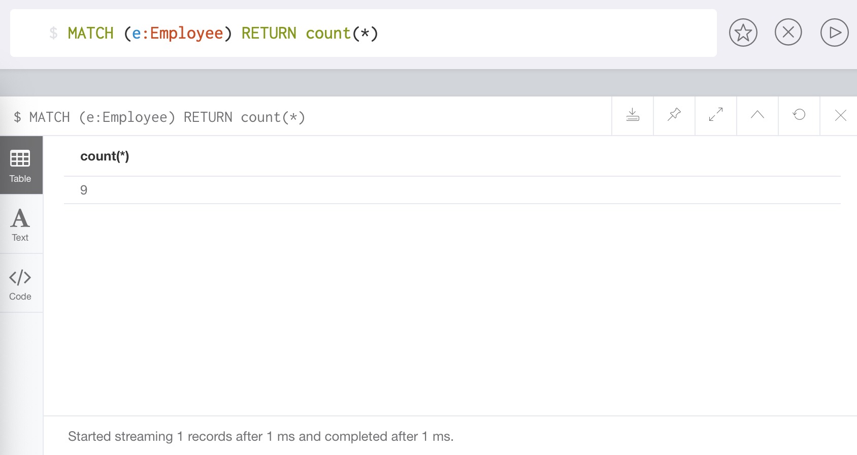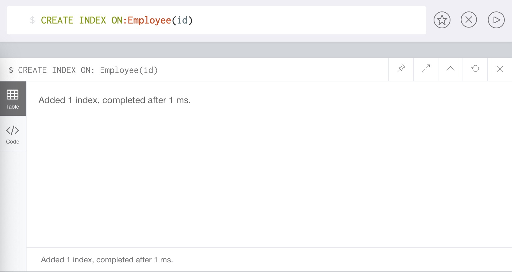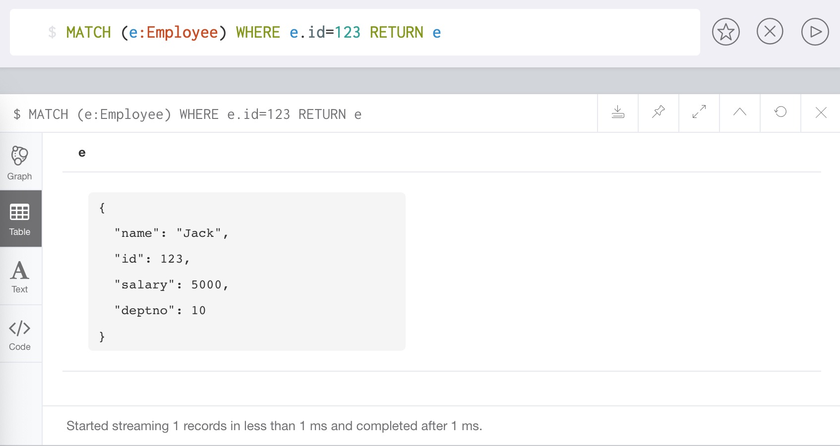# 例如下面命令创建一个节点e, 节点标签是Employee, 拥有id, name, salary, deptnp四个属性:
