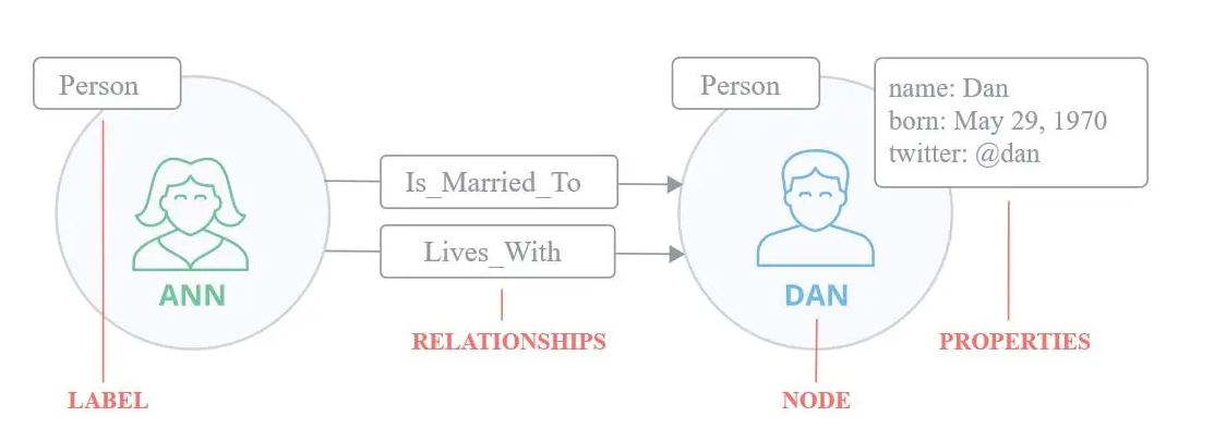 - 节点是主要的数据元素, 节点通过关系连接到其他节点, 节点可以具有一个或多个属性 (即存储为键/值对的属性), 节点有一个或多个标签, 用于描述其在图表中的作用. 示例: Person>节点.