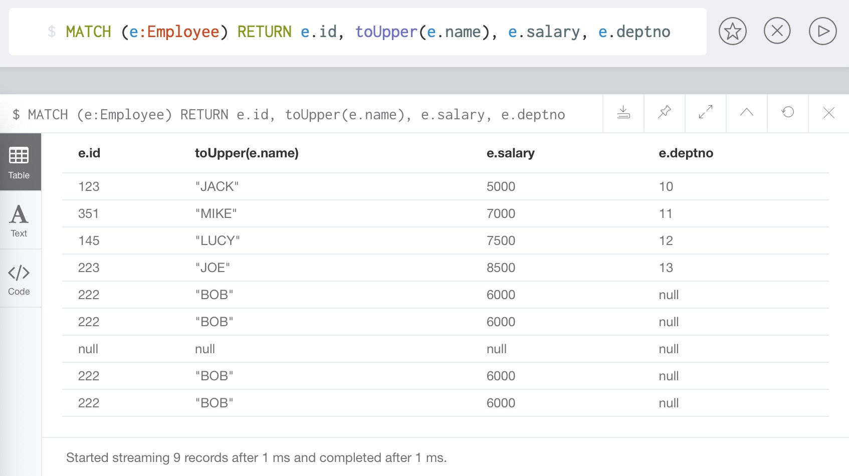 MATCH (e:Employee) RETURN e.id, toUpper(e.name), e.salary, e.deptno