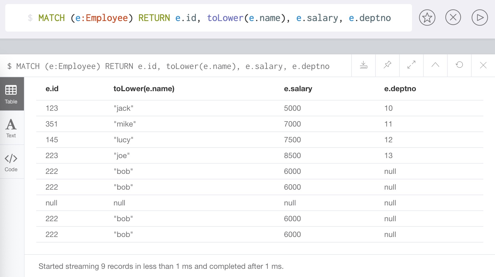 MATCH (e:Employee) RETURN e.id, toLower(e.name), e.salary, e.deptno
