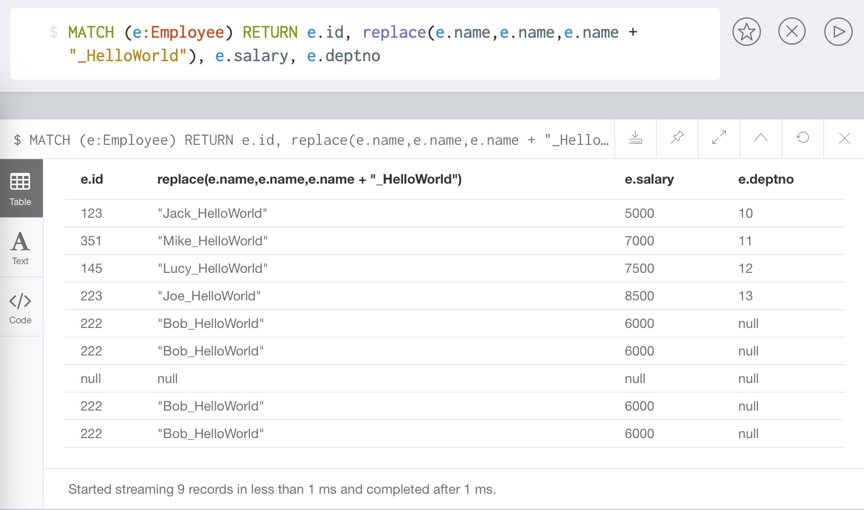 MATCH (e:Employee) RETURN e.id, replace(e.name, "_HelloWorld", ""), e.salary, e.deptno