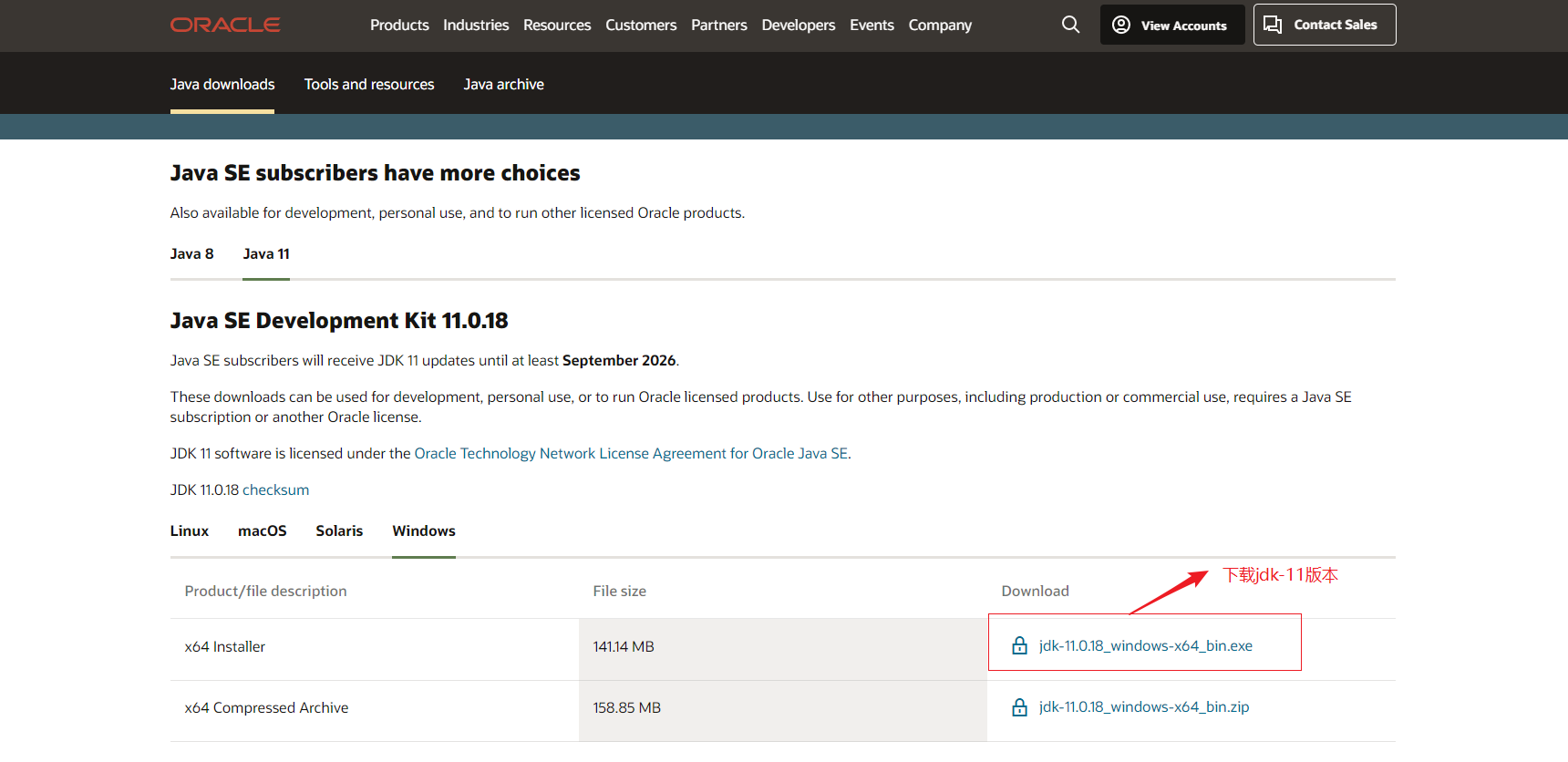 - 下载地址: https://www.oracle.com/java/technologies/downloads/#java11 (注意: 在点击下载的过程中, 可能需要需要oracle账户, 直接注册登录即可下载)