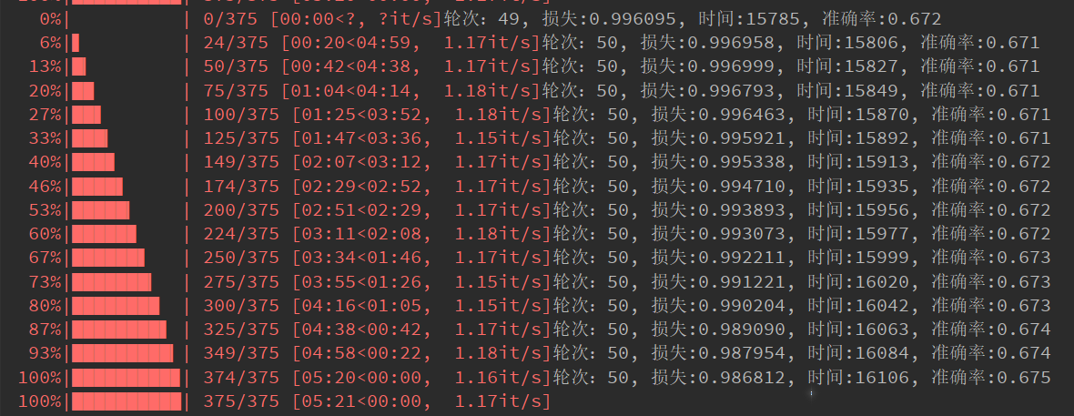 print('轮次: %d, 损失:%.6f, 时间:%d, 准确率:%.3f' % (epoch+1, tmploss, end_time-start_time, tmpacc))