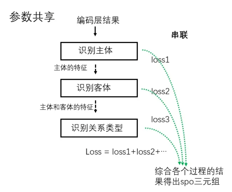 - 主体、客体和关系的抽取不是同步的 (一般情况,但是也可以其中两个任务一起进行) ,各个过程都可以得到一个loss值,整个模型的loss是各过程loss值之和.