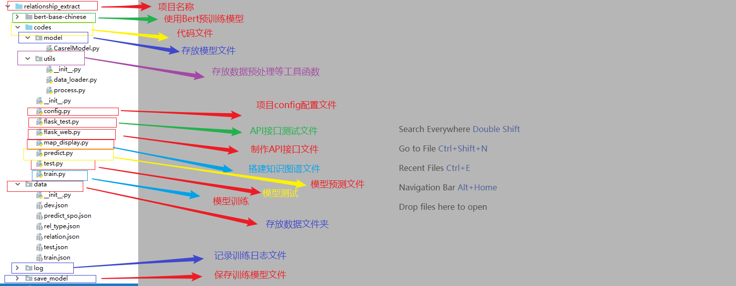- 项目的数据集包括6个json文件(其中predict_spo.json是模型预测结果,rel_type.json是带有实体类型的关系文件), 我们这里只先针对train.json、dev.json、test.json、relation.json进行介绍: